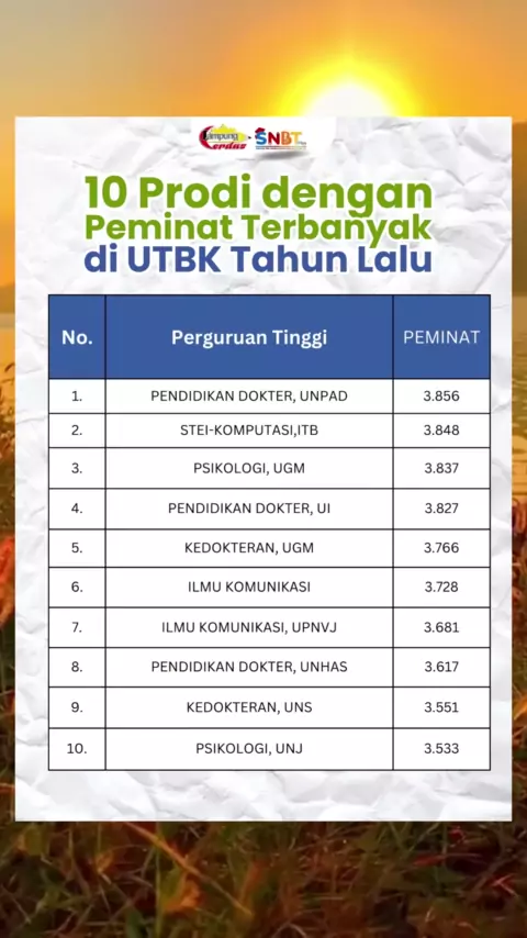 WAJIB SAVE POSTINGAN INI!! Selamat sore teman teman semua, hari ini mimin mau share nih 10 jurusan dengan pendaftar terbanyak tahun lalu, ada jurusan yang kamu incer gak nih 😊😊#masukkuliah#snbp#jalurundangan#kuliah#kampus#kuliahseru#rasionalisasi#kampusmerdeka#kelas12#sma#PersiapanKuliah#mahasiswa#ptn#kuliahtanpates #nilai