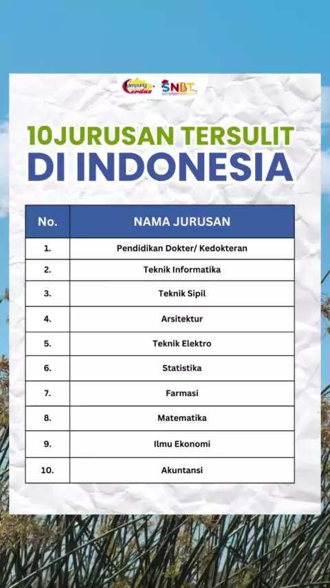 Kamu tau gak sih, jurusan tersulit yang ada di indonesia 🤔🤔 Nih mimin kasih listnya 👆👆#masukkuliah#snbp#jalurundangan#kuliah#kampus#kuliahseru#rasionalisasi#kampusmerdeka#kelas12#sma#PersiapanKuliah#mahasiswa#ptn#kuliahtanpates #nilai