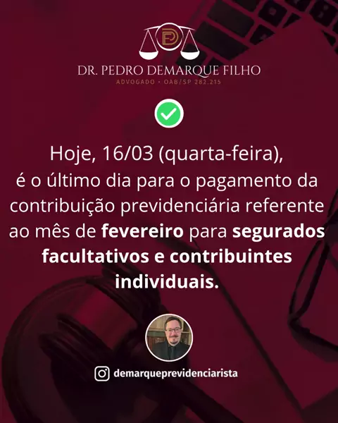 Hoje, 16/03 (quarta-feira), é o último dia para o pagamento da contribuição previdenciária referente ao mês de fevereiro. Manter os recolhimentos em dia é essencial para garantir sua proteção e o tempo de contribuição para o INSS. Não deixe o prazo passar e evite multas! Que seja uma semana abençoada para todos! Pedro Demarque Filho Advogado Especialista em Aposentadorias OAB/SP 282.215 WhatsApp: (17) 98815-8434 #filmepremiado #inss #advogado #kwai #informaçao