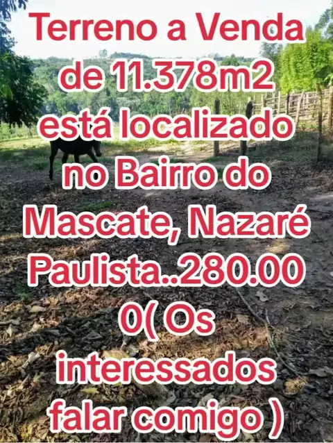 O Terreno ร  Venda possui 11.378 M2 e estรก localizado no Bairro do Mascate em Nazarรฉ Paulista., custa 280 mil .Possui รณtima topografia e estรก a + ou menos 500 mts do asfalto, com acesso ร  luz e รกgua na entrada do terreno. ร‰ um lugar muito valorizado e lugar de turismo.O terreno jรก possui escritura.Para mais informaรงรตes entre em contato comigo pelo nรบmero ยฑ551195655-7141. #Terreno #venda #Mascate #bairro #Nazare