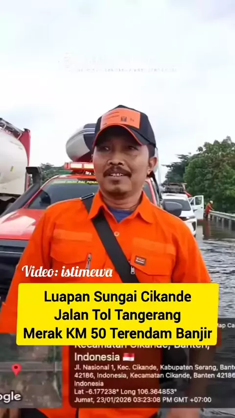 Intensitas hujan yang tinggi menyebabkan debit air sungai di wilayah Cikande meluap hingga memasuki badan jalan Tol Jakarta-Merak, tepatnya di Kilometer 50, pada Jumat sore pukul 15.30 WIB. Jumat (23/01/2026). #beritaserang #infobanten #infoserang #beritaviral #tangerangmerak