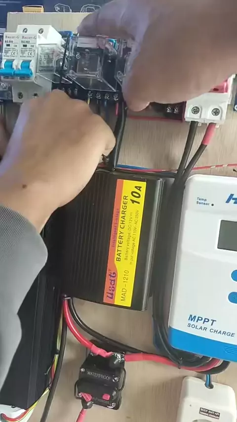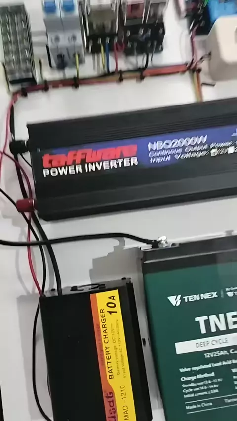 Sistem ini pakai inverter high frequency 2000 watt pure sine wave 12V untuk jadi listrik cadangan rumah. Aki diisi dari dua sumber: ☀️ Panel surya saat siang hari ⚡ PLN otomatis bantu ngecas kalau tegangan aki belum mencapai 13.8V Jadi kalau matahari kurang maksimal, aki tetap penuh karena dibantu PLN. Sistem juga punya batas bawah 11.5V, jadi saat aki mulai lemah, beban akan diputus supaya aki tidak rusak dan umur baterai lebih awet. Praktis, otomatis, dan bikin listrik cadangan lebih aman! #I...