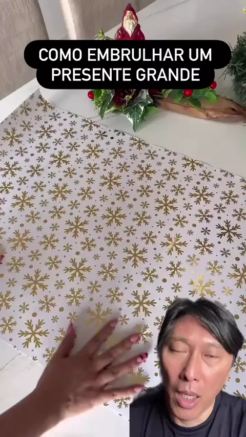É assim que você resolve quando o presente é grande e não tem saquinho pronto. Meça o papel certinho, feche as laterais no centro com fita e forme o fundo dobrando a base em losango, unindo as pontas bem firme. Coloque o presente, franza o topo fazendo aquela sanfona e prenda no meio pra criar o leque. Finalize com um enfeite e tá pronto: simples, bonito e salva qualquer aperto. Quer tentar aí também? #dicas #presentes