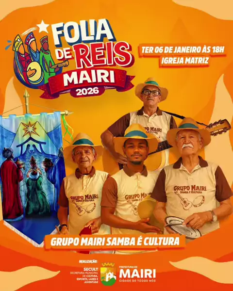 ✨ A tradição que atravessa gerações segue viva em Mairi! Nesta terça à noite, a Folia de Reis ganha voz, ritmo e devoção com o Grupo Mairi Samba é Cultura, celebrando fé, história e identidade popular. 🎶 Evento que a Prefeitura de Mairi, por meio da SECULT, resgatou, fortalecendo a cultura popular e preservando nossas raízes. 📍 Igreja Matriz 🗓️ Terça-feira, 06 de janeiro ⏰ 18h