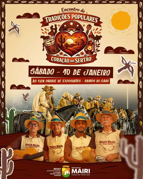 Celebre a Cultura Popular! 🎉 Neste sábado, 10 de janeiro, a partir das 12h, venha para o Parque de Exposições, Campo do Gado e participe de um evento com o grupo “Mairi Samba é Cultura". Um momento especial que reúne saberes, samba e a identidade do nosso povo, mantendo vivas as raízes culturais do nosso município. Iniciativa da Prefeitura de Mairi através da Secretaria Municipal de Cultura, Esporte, Lazer e Juventude. Vamos valorizar juntos a tradição e o legado cultural! #Mairi #CulturaPop