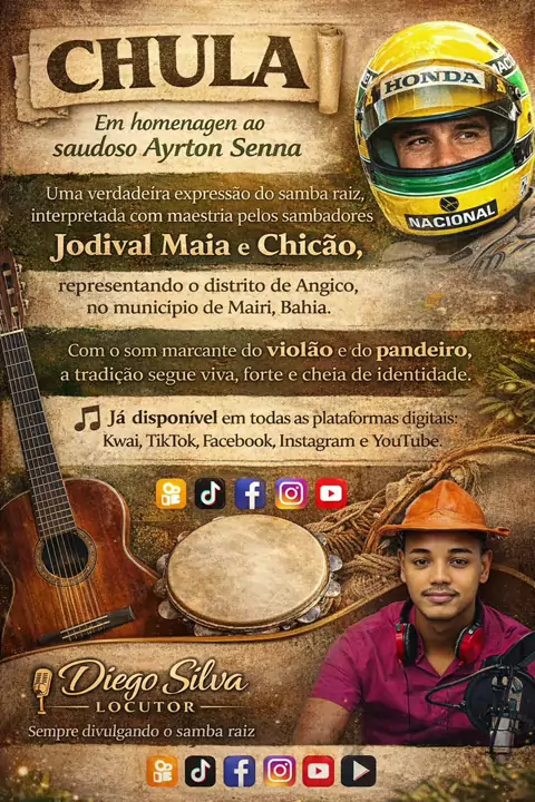 🎶 O verdadeiro samba raiz segue vivo! Direto da Fazenda Alto Alegre, em Mairi-BA, os sambadores Zé Bagaceira & Dona Isabel mostram que tradição não se perde — se fortalece com o tempo. ❤️ Um casal que canta, encanta e mantém acesa a chama da nossa cultura, embalando o som com violão, pandeiro, cuia, prato, cavaquinho, palmas e piega. 🪘🎸 E eu sigo firme nessa missão… 🎤 Diego Silva – Locutor Sempre divulgando o que temos de mais rico: o nosso samba raiz! 📲 Já disponível nas plataformas di