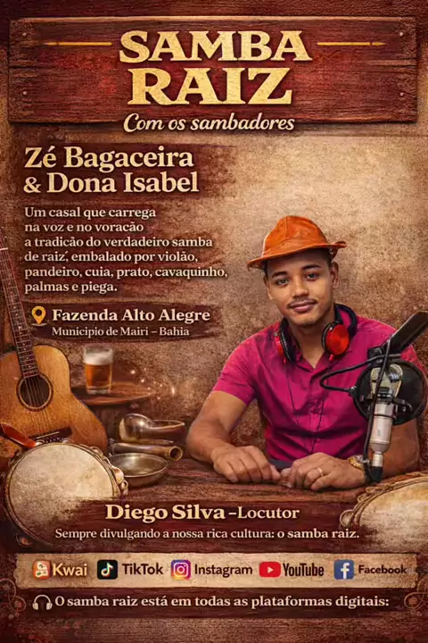 ๐ŸŽถ O verdadeiro samba raiz segue vivo! Direto da Fazenda Alto Alegre, em Mairi-BA, os sambadores Zรฉ Bagaceira & Dona Isabel mostram que tradiรงรฃo nรฃo se perde โ€” se fortalece com o tempo. โค๏ธ Um casal que canta, encanta e mantรฉm acesa a chama da nossa cultura, embalando o som com violรฃo, pandeiro, cuia, prato, cavaquinho, palmas e piega. ๐Ÿช˜๐ŸŽธ E eu sigo firme nessa missรฃoโ€ฆ ๐ŸŽค Diego Silva โ€“ Locutor Sempre divulgando o que temos de mais rico: o nosso samba raiz! ๐Ÿ“ฒ Jรก disponรญvel nas plataformas di