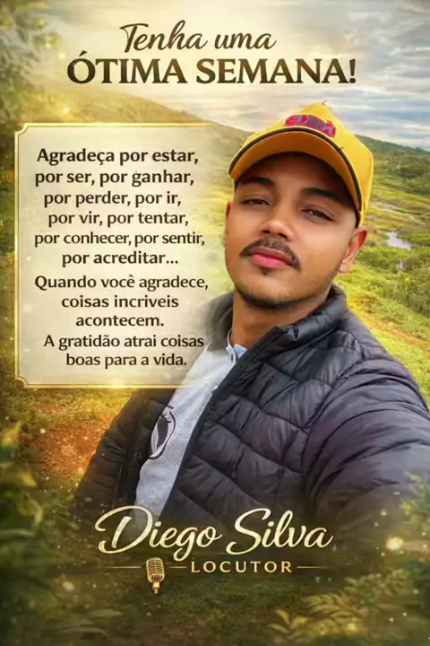 ✨ Comece a semana com gratidão no coração. Agradecer pelo que somos, pelo que temos e até pelos desafios que enfrentamos nos fortalece e nos prepara para coisas maiores. Cada passo, cada tentativa e cada aprendizado fazem parte do nosso crescimento. Quando você escolhe ser grato, a vida retribui de formas surpreendentes. 🌿 Que sua semana seja leve, produtiva e cheia de coisas boas! 🎙️ Diego Silva Locutor #Gratidão #BoaSemana #Reflexão #Motivação #Fé