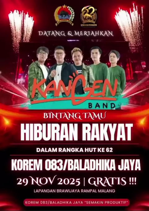 Halo Malang, piye kabare? sudah pada siap belum nostalgia bareng kangen band? yuk ramaikan dan saksikan penampilan dari Kangen Band di acara Hiburan Rakyat, Dalam Rangka HUT KE 62 KOREM 083/BALADHIKA JAYA. 29 November 2025 Lapangan Brawijaya Rampal Malang #kangenband #doyjakartatimur #malang #konser #