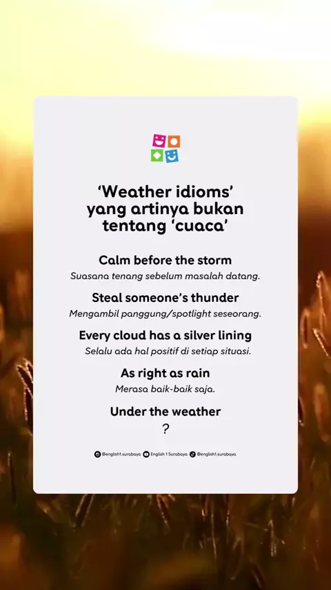 Sudah tahu belum, kalau idioms seperti "steal someone's thunder" dan "as right as rain" artinya nggak bicara soal cuaca, lho! Save buat belajar nanti ya. #tipsbahasainggris #belajarbahasainggris #english1surabaya #kursusbahasainggris