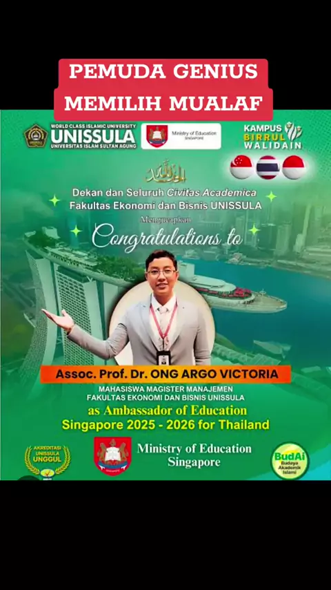Seorang mualaf cerdas, Assoc. Prof. Dr. Ong Argo Victoria, kini diangkat menjadi Ambassador of Education Singapore 2025–2026 for Thailand! Bukti bahwa iman dan ilmu bisa berjalan seiring menuju kejayaan Islam #MualafCerdas #PemudaInspiratif #OngArgoVictoria #MualafBerprestasi #KebanggaanIndonesia