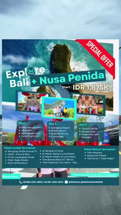 ๐™Ž๐™‹๐™€๐˜พ๐™„๐˜ผ๐™‡ ๐™Š๐™๐™๐™€๐™! LIBURAN KE BALI + NUSA PENIDA 3H2M Sekarang hanya ๐—œ๐——๐—ฅ ๐Ÿญ,๐Ÿด๐Ÿณ๐Ÿฑ๐—ž / ๐—ข๐—ฟ๐—ฎ๐—ป๐—ด ๐•Š๐•’๐•ง๐•– โ„•๐• ๐•จ, ๐•†๐•ฅ๐•จ ๐•๐•’๐•ฅ๐•–๐•ฃ!! ๐˜ฟ๐™š๐™จ๐™ฉ๐™ž๐™ฃ๐™–๐™ฉ๐™ž๐™ค๐™ฃ : โ€ข Desa Tradisional Penglipuran โ€ข Kintamani Panelokan โ€ข Agro Wisata Kopi Luwak โ€ข Pura Tirta Empul โ€ข Kelingking Beach โ€ข Broken Beach โ€ข Crystal Bay โ€ข Tanjung Benoa ( ๐—™๐—ฟ๐—ฒ๐—ฒ ๐—•๐—ฎ๐—ป๐—ฎ๐—ป๐—ฎ ๐—•๐—ผ๐—ฎ๐˜) โ€ข Pusat Oleh-Oleh Khas Bali ๐™„๐™ฃ๐™˜๐™ก๐™ช๐™™๐™š : โ€ข Menginap di Hotel *3 ( 3H2M ) โ€ข Mobil + Sopir + Bbm โ€ข Driver Merangkap Guide ...