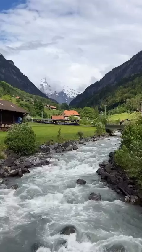 Passeios de trem panorâmicos pelas encantadoras cidades da Suíça! 🚞 📍Vale Lauterbrunnen, Suíça 🇨🇭