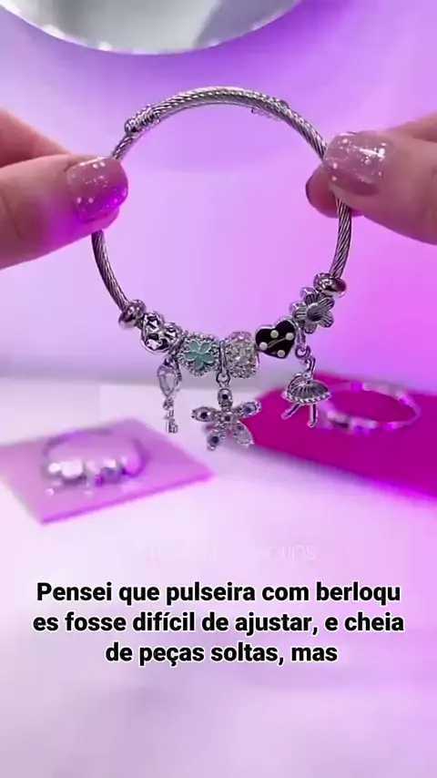 Pulseira de berloques que se ajusta perfeitamente e brilha no seu pulso #PulseiraFeminina #BerloquesLuxo #ModaFeminina #AcessóriosComEstilo #LookPerfeito