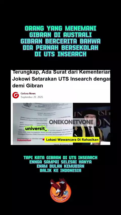 Orang yang menemani Gibran di Australi Gibran bercerita bahwa dia pernah bersekolah di uts insearch Tapi kata Gibran di uts insearch engga sampai selesai hanya enam bulan kemudian balik ke indonesia