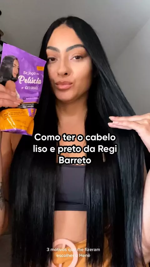 #podeapostar no #HenêPelúcia p/ um cabelão preto e liso que causa 😍 Se liga nos 3 motivos que fizeram a @regi_barreto viver um relacionamento sério com esse produtaço 4 em 1, que alisa, tinge de preto, trata e dá brilho. #embelleze #henê #henegatas