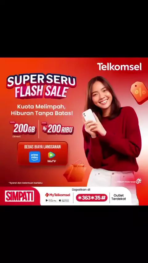 Kirain ada apa πŸ™‚β€β†”οΈ FLASH SALE SUPER SERU akhirnya hadir lagi! πŸŽ‰ Saatnya kamu nikmati hiburan tanpa batas dengan kuota super melimpah dari Telkomsel. Cuma dengan Rp200.000, kamu sudah dapat: πŸ”₯ 200GB kuota untuk 28 hari πŸ”₯ Bebas biaya langganan Prime Video & WeTV Penawaran ini cuma 8-11 Desember 2025. Jadi jangan tunggu sampai kehabisan! Dapatkan penawaran menarik lainnya! πŸ“² Beli sekarang lewat aplikasi MyTelkomsel atau πŸ“ž *363*35# ✨ Bisa juga langsung ke outlet terdekat. Yuk… amankan paket...