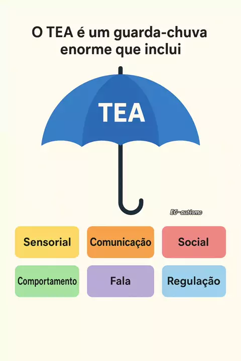 O autismo é como um grande guarda-chuva. Debaixo dele estão várias áreas que fazem parte do TEA.. o sensorial, a comunicação, o social, o comportamento, a fala, a regulação emocional e o desenvolvimento. Cada criança autista vive esse guarda-chuva de um jeito único #autismo #Tea