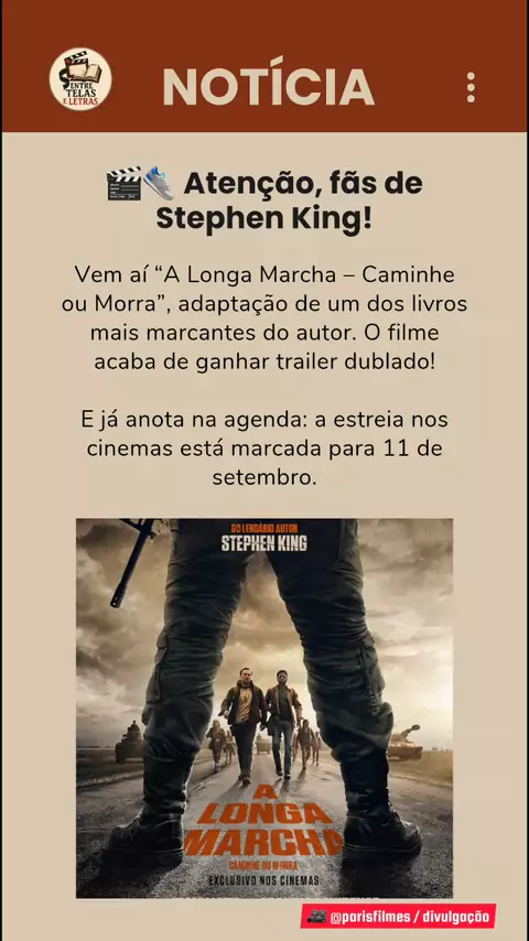 🎬👟 Atenção, fãs de Stephen King! Vem aí “A Longa Marcha – Caminhe ou Morra”, adaptação de um dos livros mais marcantes do autor. O filme acaba de ganhar trailer legendado e dublado! E já anota na agenda: a estreia nos cinemas está marcada para 11 de setembro. 👉 Curtiu a novidade? Então se inscreve no canal pra não perder nenhuma dica de cinema! 🍿✨ Música: Walk In The Woods Músico: Jeff Kaale 🎥 @parisfilmes #ALongaMarcha #CaminheOuMorra #ParisFilmes #VemAí #StephenKing