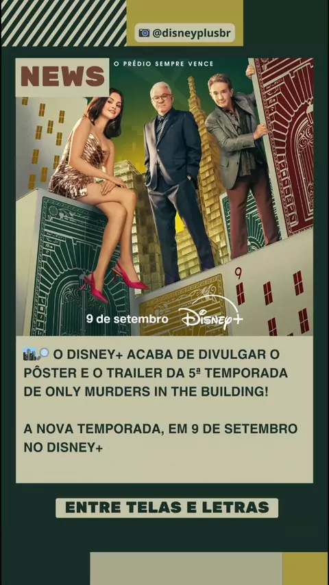 🏙️🔎 O Disney+ acaba de divulgar o pôster e o trailer da 5ª temporada de Only Murders in the Building! A série com Steve Martin, Martin Short e Selena Gomez volta no dia 9 de setembro, já com os três primeiros episódios disponíveis. Depois disso, novos capítulos chegam toda semana. 📷 @disneyplusbr / divulgação #OMITB #DisneyPlus #entretelaseletras #selenagomez