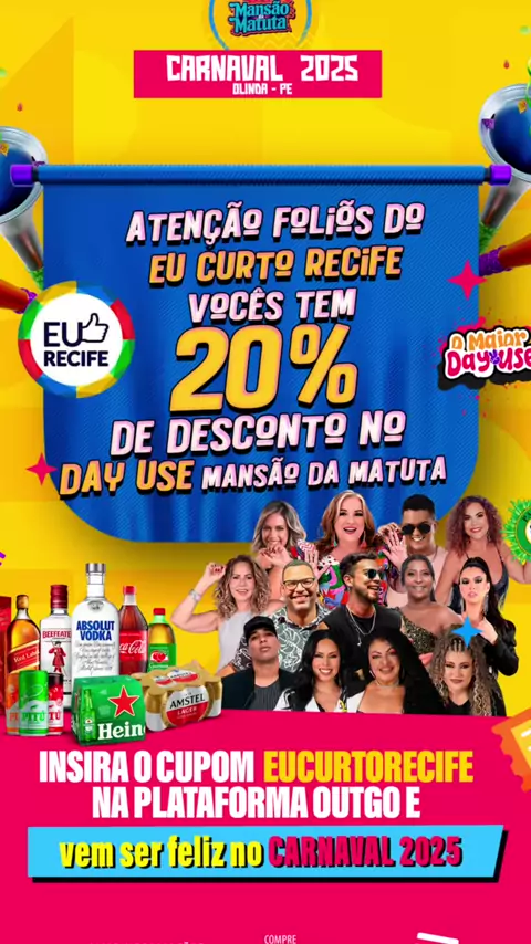 🤩ATENÇÃO FOLIÕES DO EU CURTO RECIFE🎉 A MANSÃO DA MATUTA tá oferecendo 20% de desconto pra tu que quer curtir o carnaval de Olinda com conforto e segurança🪇 🤩 ACESSE AGORA 🕺🏻👇 https://www.outgo.com.br/camarote-mansao-da-matuta e COLOQUE O CUPOM EUCURTORECIFE para ganhar seu desconto SERVIÇOS INCLUSOS🎊 ================ Oper Bar Premium🍺 Whisk Red Label Vodka Absolut Gin beefeater Cerveja Heineken Cerveja Amstel Pitu Ice abacaxi e limão Refrigerante Coca e Guarana Água ===========
