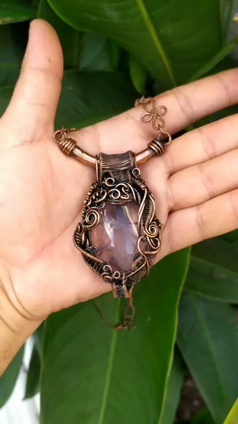 Amuleto feito em Cobre contendo a pedra quartzo rosa #evolucaoaartesanatos #joiasartesanais