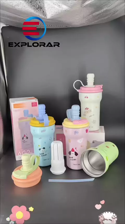 Copo Garrafa Térmica Portátil inox 600ML Com Desenho Fofa Canudo E 2 Bicos Alça Para Trabalho Escola#garrafa #Escola #Infantil #copo #academia