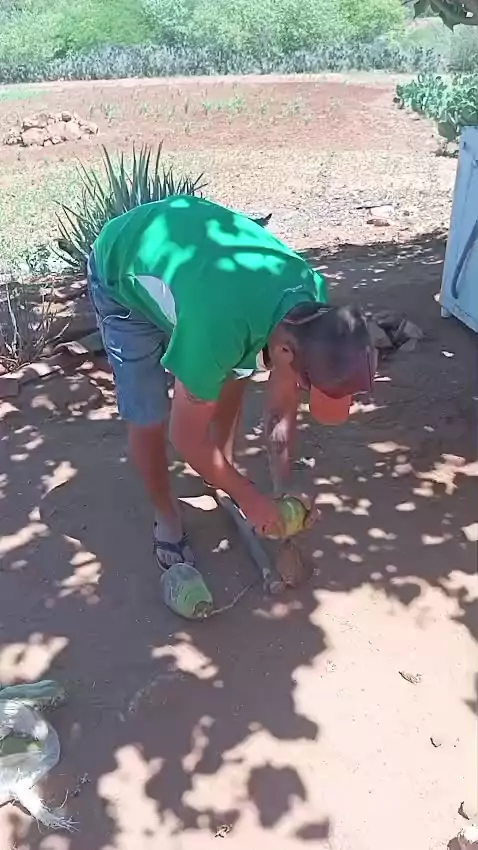 Descascando coco na enchada