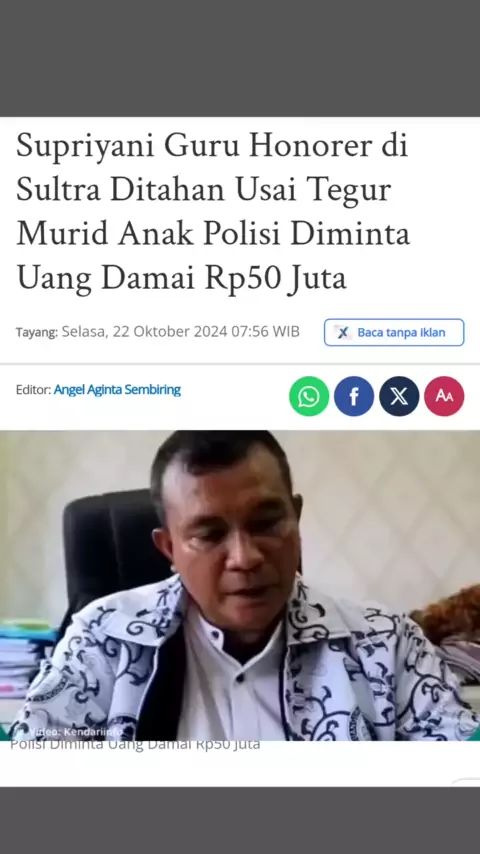 Supriyani Guru Honorer di Sultra Ditahan Usai Tegur Murid Anak Polisi Diminta Uang Damai Rp50 Juta https://medan.tribunnews.com/2024/10/22/supriyani-guru-honorer-di-sultra-ditahan-usai-tegur-murid-anak-polisi-diminta-uang-damai-rp50-juta