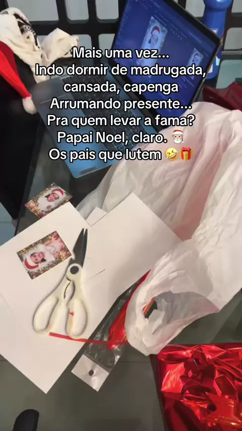 SOCORRO 😂 Ano que vem quero receber pelo serviço prestado, porque trabalhar de madrugada, cansada, capenga, embalando presente… pro Papai Noel levar a fama e ainda as crianças agradecerem ELEEEE 🥹🎅 enquanto olham pros pais tipo: “tá… e o presente de Natal de vocês?” 😂🎁 #papainoel #natal #mamaenoel #familia #presente