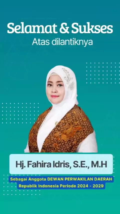 Selamat & Sukses Atas Dilantiknya Ibu Hj. Fahira Idris, S.E., M.H sebagai Anggota Dewan Perwakilan Daerah Republik Indonesia periode 2024 - 2029 Dapil Daerah Khusus Jakarta. Saya doakan semoga Ibu dalam keadaan sehat, selamat. Semoga senantiasa diberikan kemudahan & kelancaran dalam menjalankan amanah yang diberikan. Serta terus bisa memberikan manfaat bagi seluruh warga, khususnya untuk warga Jakarta. Dan saya doakan juga semoga dapat menjalankan tugas penuh dengan dedikasi yang tinggi. Aamiin...