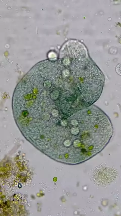 Este é um Stentor coeruleus e está EXPLODINDO por ter sido mordido por outro organismo unicelular! Eu não esperava isso, nunca vi algo pequeno fazendo isso com um Stentor gigante. Mas você sabe o que eles dizem, há uma primeira vez para tudo! a espécie de organismo menor, talvez um Prorodon, ele estava 'sugando' um pouco da membrana de Stentor maior. (Jam's Germs) #noticias #bizarrasecuriosidades #estranho #incrível #fy