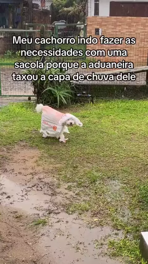 🚨GRAVE: Cachorro é obrigado a usar sacolas plásticas no corpo após sua capa de chuva ser taxada.