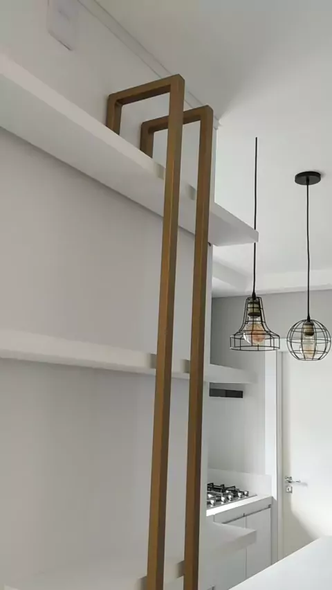 Bom dia! pendentes estilo retrô super em alta, fitas de led na preteleira com dourado.