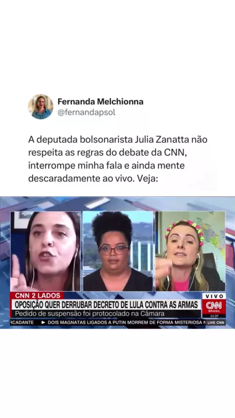 🚨“Aqui não é tuas redes sociais pra você mentir de forma sistemática”. A deputada bolsonarista Julia Zanatta tentou mentir descaradamente no debate da CNN sobre o aumento do número de mortes depois do decreto do bolsonaro que flexibilizou o porte de armas de fogo. Veja: