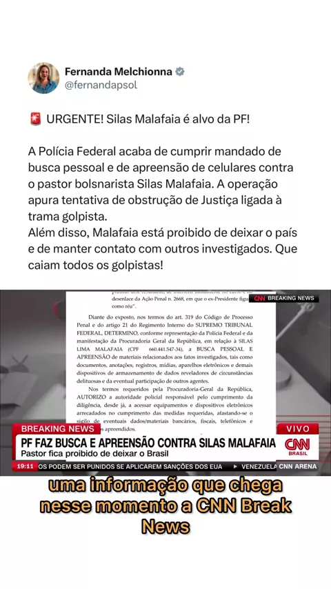 🚨 URGENTE! Silas Malafaia é alvo da PF! A Polícia Federal acaba de cumprir mandado de busca pessoal e de apreensão de celulares contra o pastor bolsnarista Silas Malafaia. A operação apura tentativa de obstrução de Justiça ligada à trama golpista. Além disso, Malafaia está proibido de deixar o país e de manter contato com outros investigados. Que caiam todos os golpistas!