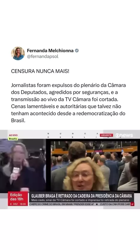 CENSURA NUNCA MAIS! Jornalistas foram expulsos do plenário da Câmara dos Deputados, agredidos por seguranças, e a transmissão ao vivo da TV Câmara foi cortada. Cenas lamentáveis e autoritárias que talvez não tenham acontecido desde a redemocratização do Brasil. De quem veio a ordem este ato inaceitável de censura??? Novamente, um tratamento completamente diferente de quando GOLPISTAS subiram mesa da presidência e lá ficaram por 48 horas. Milha solidariedade a todos os profissionais da impre