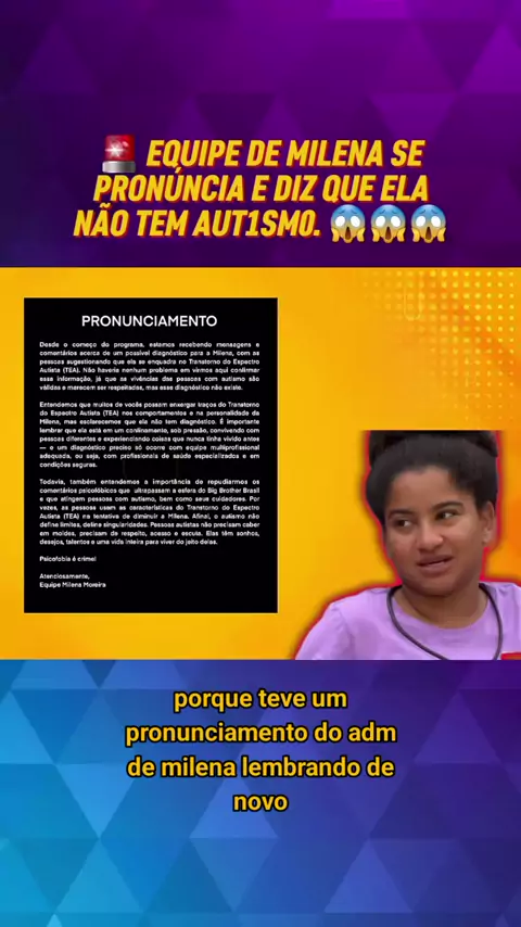 Equipe de Milena se pronuncia e diz que ela não tem aut1sm0. Fonte Internet #bbb26 #fofoca #BomPraKWAI