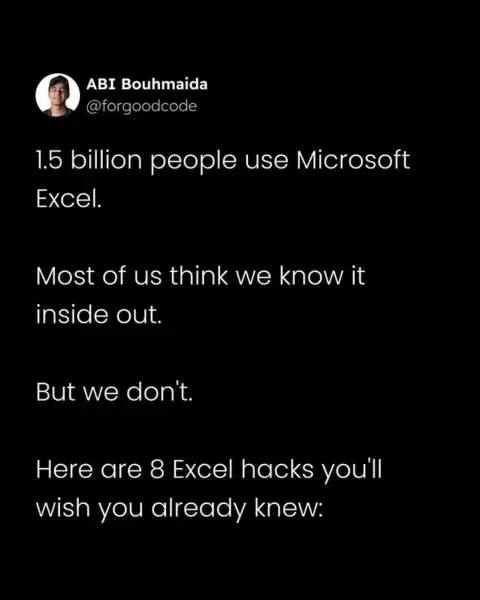 Learning to manipulate and analyze tons of rows of data is enough to make anyone go cross-eyed. So, who wouldn't want a trick that promises to save you time, stress, and elbow grease? Well, today's your lucky day! Follow @exceldictionary for more hacks like this. If you enjoyed this, follow me @forgoodcode for more content like this. #excel #microsoft #microsoftexcel #google #tech #programming #coding #programmer #javascript #code #coder #software #technology #learn #softwaredeveloper #computer...