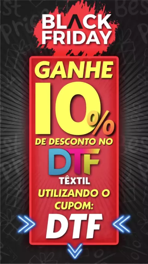 🔥 Promoção Relâmpago DTF Têxtil - 10% OFF! 🔥 🕒 Começa HOJE, 19/11, às 18h e vai até amanhã, 20/11, às 23h59 ou até atingirmos os primeiros 100 metros vendidos! 💥 Garanta 10% de desconto no DTF Têxtil usando o CUPOM: DTF. 🚨 É a sua chance de economizar e turbinar sua produção com materiais de alta qualidade! 🌐 Acesse nosso site agora e aproveite! 📲 Precisa de ajuda? Fale com a gente pelo WhatsApp: (81) 3226-5555. ⚡ Não perca tempo, a promoção é por tempo limitadíssimo! #PromoçãoDTF #