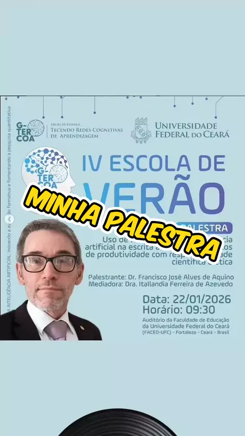O Grupo de Estudo e Pesquisa Tecendo Redes Cognitivas de Aprendizagem (G-TERCOA/CNPq), vinculado à Faculdade de Educação da Universidade Federal do Ceará (FACED/UFC), convida professores, pesquisadores, estudantes e o público em geral para participarem da Escola de Verão 2026, que acontecerá nos dias 22 e 23 de janeiro de 2026, de forma presencial, no Auditório da Faculdade de Educação da Universidade Federal do Ceará (FACED/UFC), em Fortaleza. #palestra