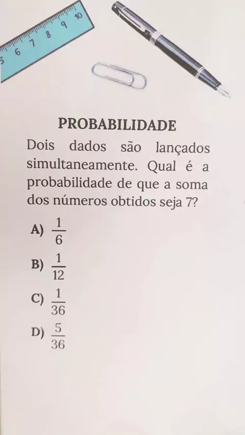 Questão de probabilidade que pode cair no ENEM esse ano. Dois dados são lançados simultaneamente, qual é a probabilidade de que a soma dos números obtidos seja 7? #matematica #AULA #Escola #aprender #enem