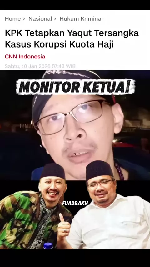 KPK menetapkan Eks Menag, Yaqut Cholil Qoumas, bersama Eks Stafsusnya Ishfah Abid Aziz (Gus Alex) sebagai tersangka kasus dugaan korupsi kuota haji, pada Kamis (8/1/2026). Penetapan tersangka diumumkan Juru Bicara KPK Budi Prasetyo pada Jumat (9/1/2026), berdasarkan kecukupan alat bukti terkait kebijakan diskresi pembagian 20.000 kuota haji tambahan dari Pemerintah Arab Saudi.
