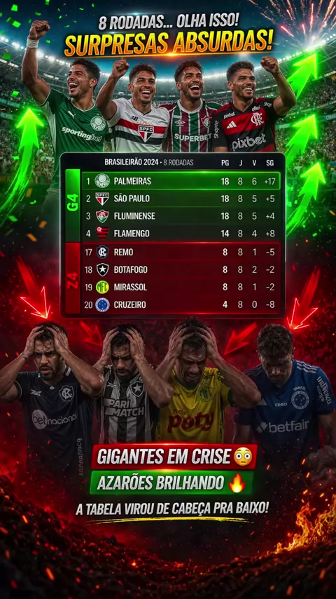 📊 Brasileirão 2026 após 8 rodadas: 🥇 Palmeiras — 16 pts — LÍDER 4° Flamengo — 14 pts — G4 🏆→📉 Botafogo — 3 pts — LANTERNA Campeão do mundo brigando pra não cair. Isso é o futebol brasileiro! 👇 Quem vai ser campeão do Brasileirão 2026? #Brasileirao2026 #Palmeiras #Flamengo #Botafogo #FutebolDePlaca