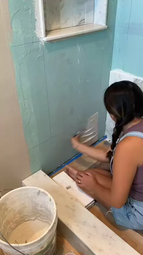 96 more tiles until this shower is finished! 🧚🏽🫧#firsthome#firsttimehomebuyer#oldhouse#diyhomeprojects#diyhomemakeover#diybathroom#bathroommakeover#bathroomtile#bathroomremodel#bathroomdesign#bathroomrenovation#tileinstallation