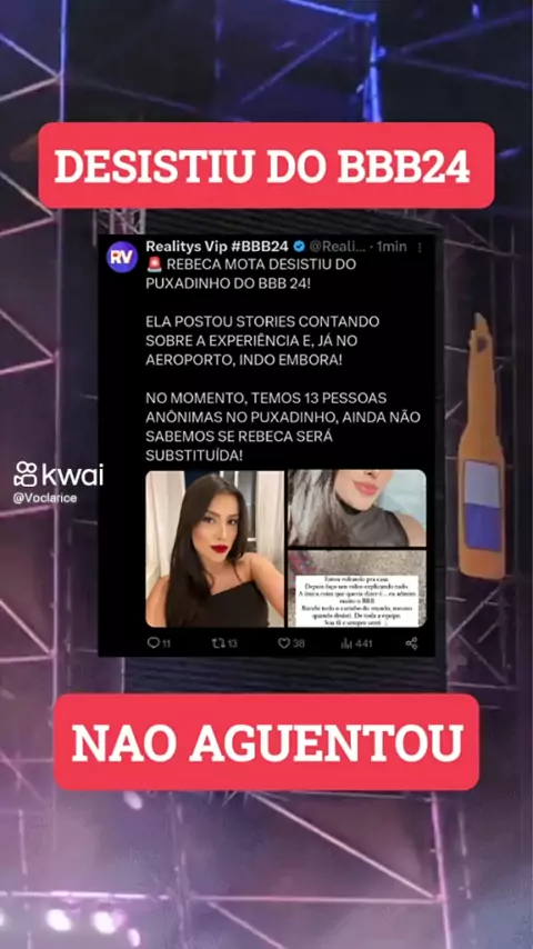 📣Errada não tá! Se quisesem ela na casa tinha colocado DIRETO🗣passar por perrengues que não vai dá em nada🤔 🚨 A cirurgiã-dentista Rebeca Mota afirma ter desistido do Puxadinho do BBB 24, repassa o Realitys VIP. Com isso, somente 13 pessoas seguirão na disputa para uma vaga na casa mais vigiada do Brasil. "Náo soube controlar meus sentimentos, sempre achei que desistir era sinal de fraqueza, mas tive que ser muito forte para bater naquela porta e dizer o que tinha desistido do meu sonho" #b