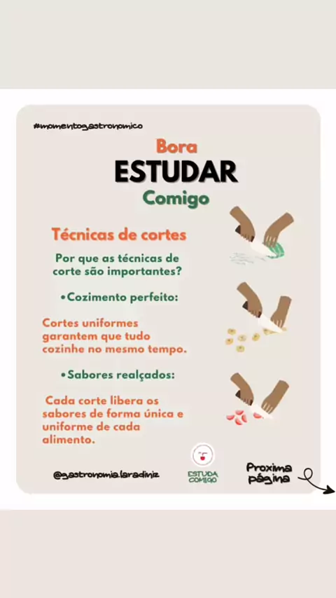 Estuda comigo! @gastronomia.laradiniz (Conteúdo informativo no link da bio do Instagram {Técnicas de cortes com legumes} possuem 2 links do Canva com o conteúdo completo que eu estive estudando 🥴♥️🙏🏽) • Técnicas Gastronômicas de Cortes: • Julienne: Tiras finas (3mm x 5cm). Ideal para saladas e refogados. • Brunoise: Pequenos cubos (2mm). Perfeito para molhos e risotos. Conteúdo completo no Instagram!! #Gastronomia #auladegastronomia #aula #cozinhando