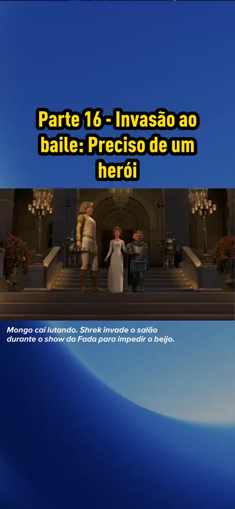 Parte 16 #Shrek2 Mongo cai lutando. Shrek invade o salão durante o show da Fada para impedir o beijo.