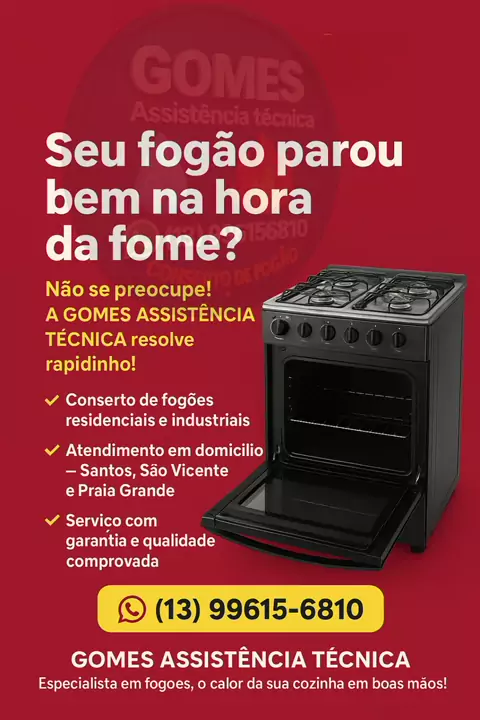 🔧🔥 Seu fogão parou bem na hora da fome? Não se preocupe! A Gomes Assistência Técnica resolve rapidinho! ✅ Conserto de fogões residenciais e industriais ✅ Atendimento em domicílio – Santos, São Vicente e Praia Grande ✅ Serviço com garantia e qualidade comprovada 📞 Chame agora no WhatsApp: (13) 99615-6810 📍 Gomes Assistência Técnica – Especialista em fogões, o calor da sua cozinha em boas mãos! #ConsertoDeFogão #AssistenciaTecnica #Fogão #Santos #SãoVicente