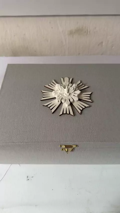 Caixa revestida em tecido com aplicação em MDF e resina na frente, dentro bordado para padrinhos de batismo. Acompanha Chandon, toalha bordada, vela, terço e convite.